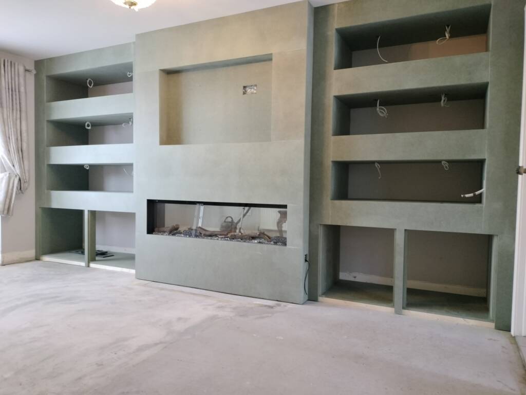 The highlight of the renovation was the installation of a luxurious walnut herringbone floor. This choice of flooring not only added a rich, warm tone to the room but also introduced a classic pattern that brings both elegance and a sense of timeless sophistication. Complementing the new flooring, we crafted a bespoke feature wall that became the focal point of the living room. This custom wall was designed to house an electric fireplace, which adds a cozy and contemporary touch.